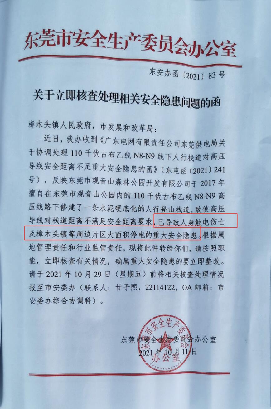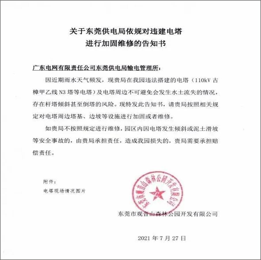 2021年7月观音山公园向东莞市供电局快递了“关于东莞供电局依规对违建电塔进行加固维修的告知书”,书中内容为:“广东电网有限责任公司东莞供电局输电管理所:因近期雨水天气频发,现贵局在我园违法搭建的电塔(110kV 古樟甲乙线 N3 塔等电塔〉及电塔周边不可避免会发生水士流失的情况,存在杆塔倾斜甚至倒塔的风险。现特发此告知书,请贵局按照相关规定对电塔周边塔基、边坡等设施进行加固或者维修。”