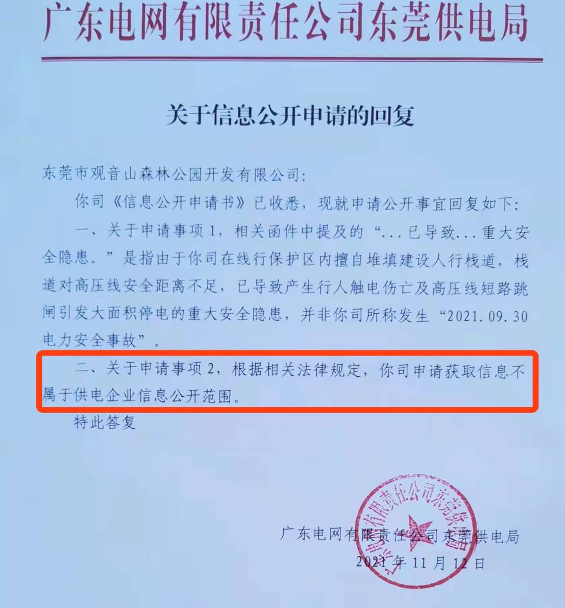 10月26日,观音山国家森林公园向东莞供电局提出信息公开申请,要求该局公开上述安全事故的主要信息。