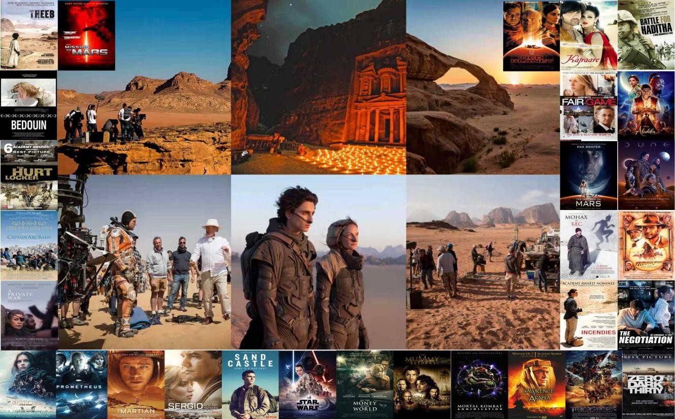 由导演丹尼斯·维伦纽瓦 (Denis Villeneuve)拍摄的《沙丘》(Dune) 在第 94 届奥斯卡颁奖典礼上获得了六项奥斯卡奖,影片的主要拍摄地点大部分都在约旦——特别是瓦迪拉姆和瓦迪阿拉巴,在众多电影选址拍摄地标中脱颖而出。 《沙丘》成为本届奥斯卡颁奖典礼获奖最多的影片,包揽了最佳音效、最佳原创配乐、最佳影片剪辑、最佳艺术指导、最佳视觉特效和最佳摄影等奖项,成为最大赢家。