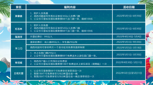 五一期间,芙蓉镇双世度假区推出芙蓉镇华服游园会、红石林潮玩运动会、猛洞河初夏爽玩季、不二门十二花神秀、老司城五一祭祀大赏、土司大营亲子嘉年华等六大精彩纷呈的主题活动,汇聚土家非遗、山水美景、国风国潮、激爽体验于一体的特色活动,为游客奉上丰盛的文旅大餐!
