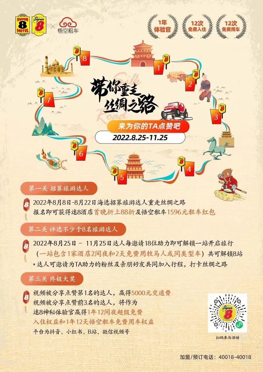 举例来说,在速8酒店品牌月的活动内容层面,其一方面与悟空租车等多业态强强联手,解决了消费者“在路上”的交通难题,构成了吃喝住行娱的完美闭环,推动活动顺利进行。另一方面在招募参与者的基础上,增加了“好友助力”环节,在解锁新城市站点的同时,也在扩大活动的声量和品牌影响力;在渠道营销层面,速8酒店自身拥有线上线下多个推广渠道,包括官网、微信、视频号、微博、抖音、B站等,共同推动活动多链路发酵;在福利拉新促活层面,速8酒店此次品牌月也是诚意满满。据了解,本次参与品牌月活动的消费者可以获得首单折上88折住宿优惠、悟空租车1596元租车红包。与此同时,消费者在参与活动中拍摄并分享视频,点赞量第一即可一次性获得5000元交通费,点赞量前三名即可获得1年12次超级免费入住及1年12次悟空租车免费用等多项权益。