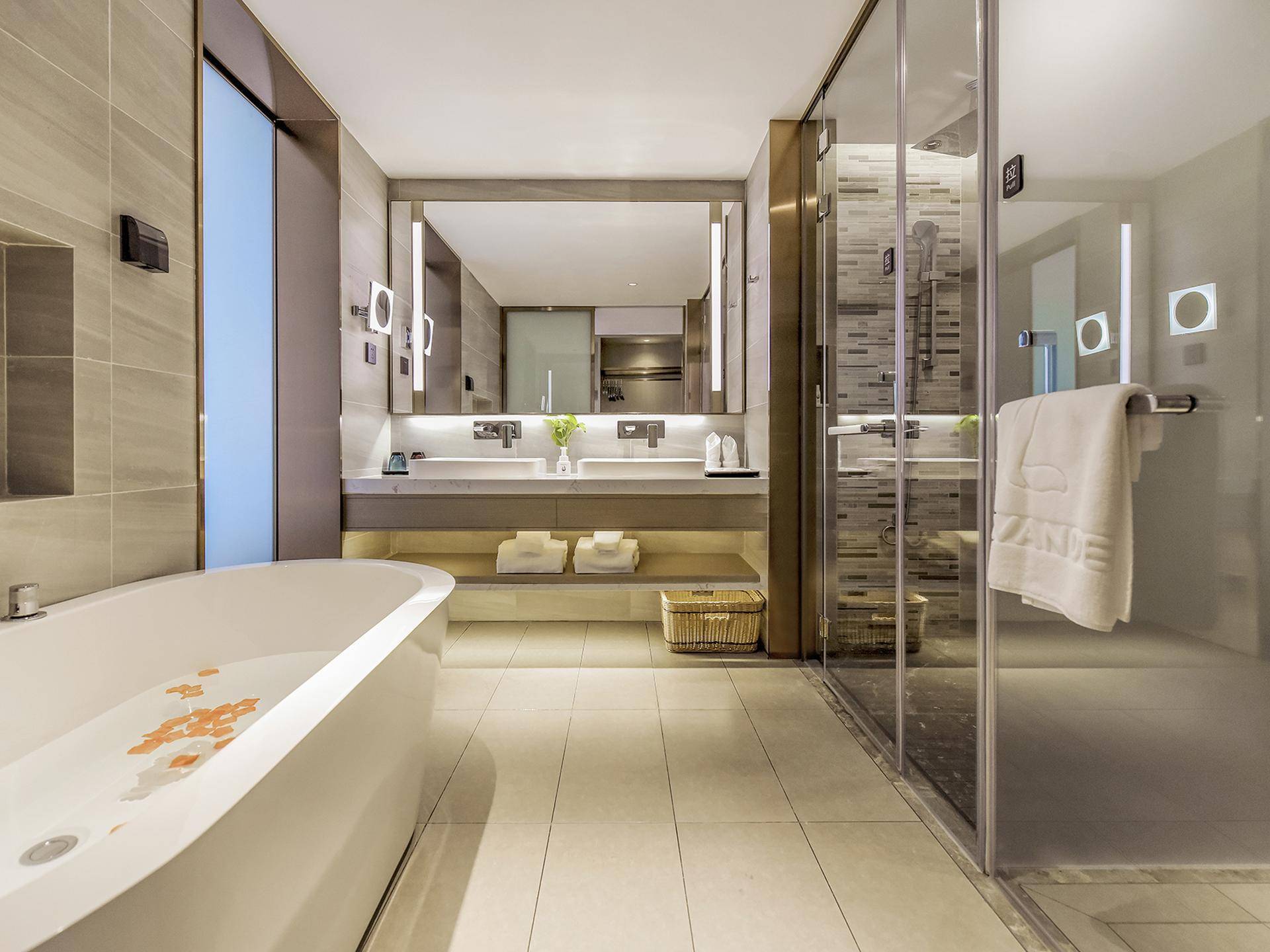 还有定制的洗漱用品,添加天然薰衣草精油,淡淡的香气舒缓宁神,从内而外地释放住客压力。浴室里还配备了浴缸,客人能在此泡澡放松,洗去旅途中的疲惫。
