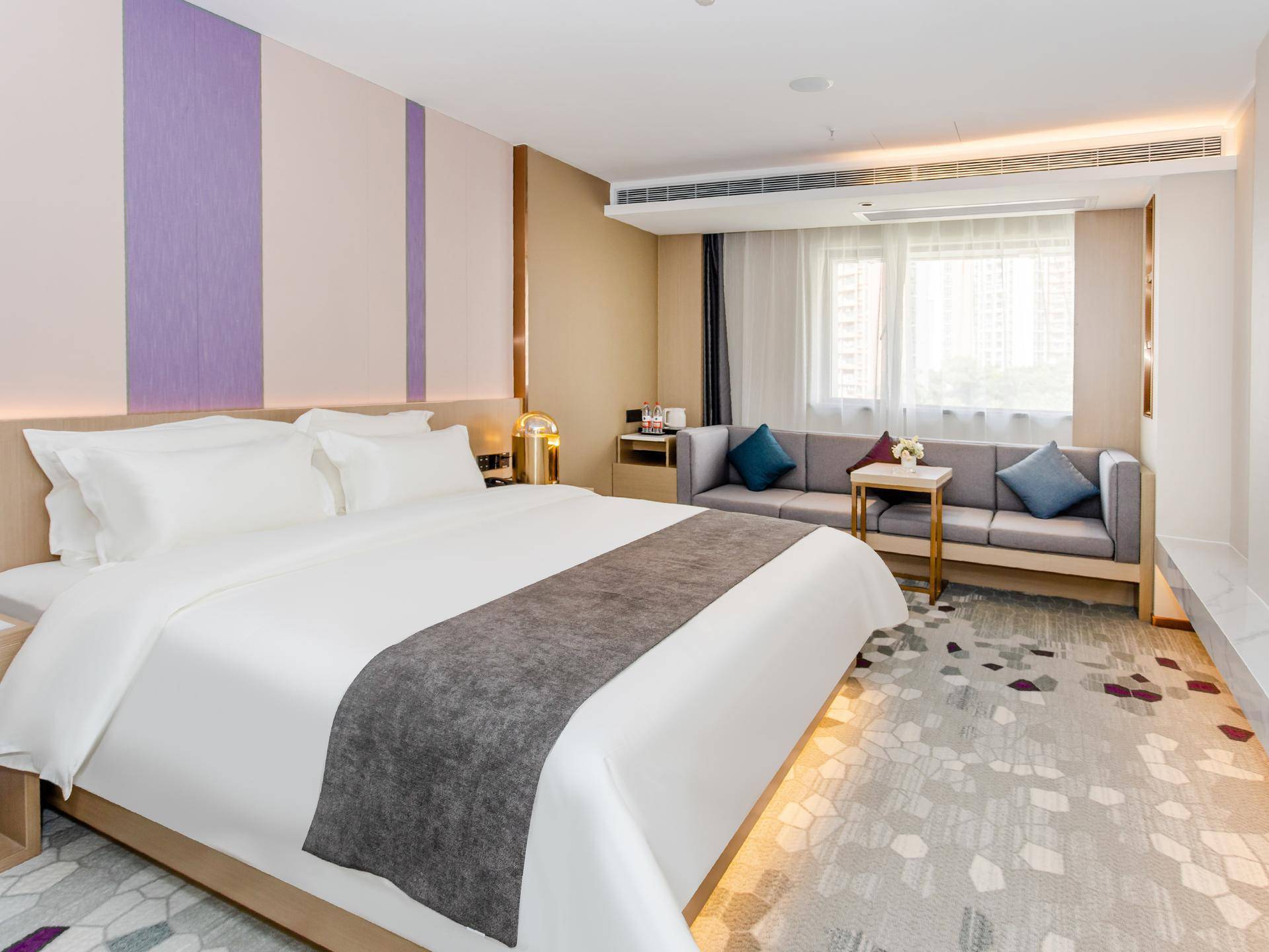 这抹优雅浪漫的紫色调延续至客房空间点缀着各处细节。慵懒自在,是麗枫酒店客房的关键词。颇具亲和力的纹理感材料带着自然的气息,带有麗枫紫的地毯、温馨的光线、柔软的沙发和软垫,客房的每个角落都散发着温暖而又自在的气息,。