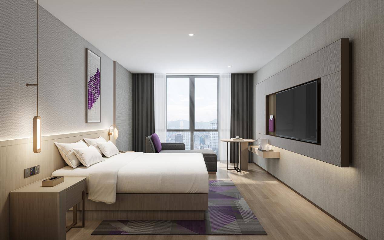 客房内的亚克力挂画晶莹剔透,标志性的薰衣草紫带来别样的浪漫气息,复合地板和木纹地砖与地毯的组合也更具亲和力。原来的隔断被玻璃屏风取代,电动窗帘也减少了窗帘盒,一眼望过去,整个客房的空间更加高挑舒展。