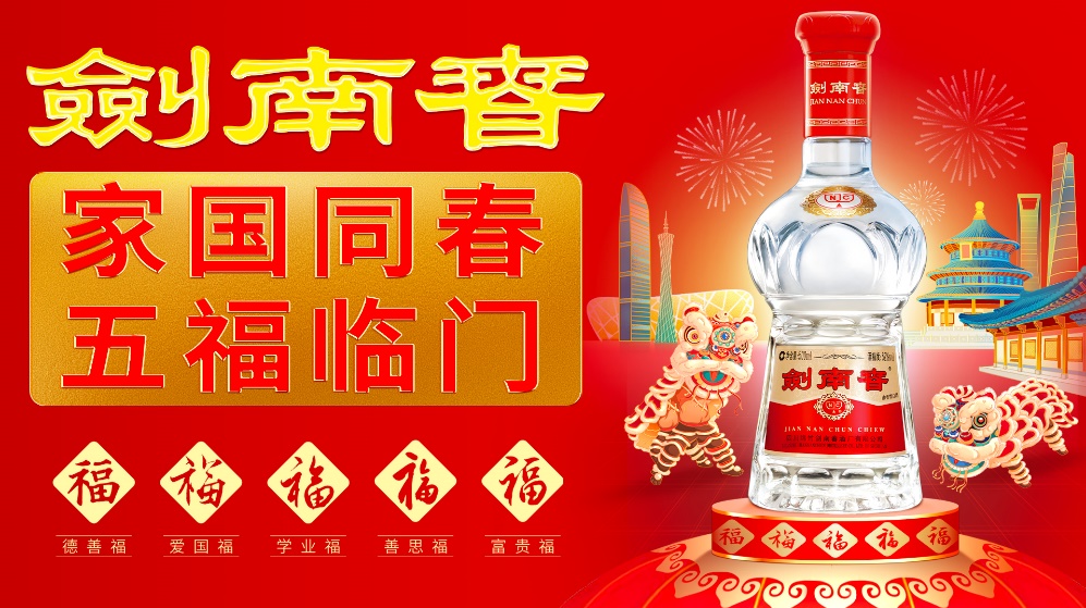 在春节来临之际,剑南春与人民日报新闻客户端联合,推出“家国同春·五福临门”活动,以“新春送福官”的身份向全国人民送上新年贺礼与新年福气,并邀请广大消费者登陆剑南春电商旗舰店一起“集五福”、“送五福”、“赏五福”,共同传承发展传统文化,并祝愿祖国繁荣昌盛,祝福全国人民身体健康,新春快乐。