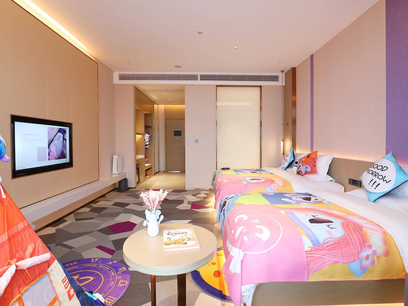 十二星座麗小懒亲子家庭房,不但是一家人的度假房,也是是孩子的游乐场。以麗枫酒店的吉祥物“麗小懒”为主题,各种孩子喜欢的卡通元素和特色星座帐篷等设施,为孩子打造一个充满童趣的空间,给父母更多放松和休闲的时间。此外软硬适中的床垫和舒适亲肤的床品,让年长的住客也能睡的舒心,住的安心。