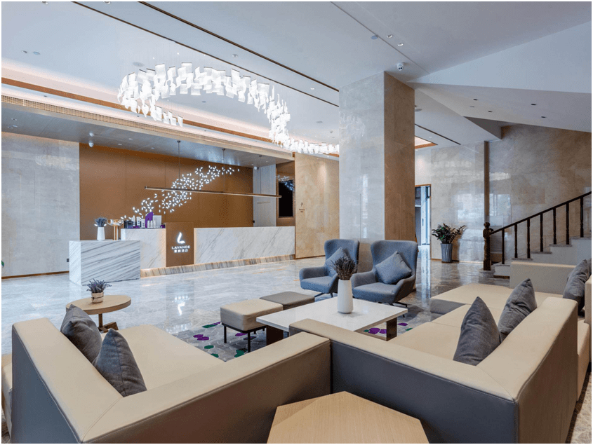 住客在步入酒店大堂那一刻起就能闻到标志性的薰衣草香气,整体原木色泽与光影配搭带来柔和舒适的视觉体验,前台背景墙上的薰衣草花瓣与摇曳的吊灯交相呼应,营造出柔和安静的氛围,旅途中的疲惫与浮躁的在此刻也渐渐被抚平。