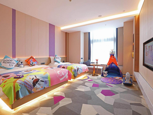 当然,暑期游的主角是小朋友们,麗小懒12星座亲子房将睡眠空间变成了生活体验场景,给孩子充分释放童真天性的空间。麗枫酒店与年轻新星插画师铅笔君在原有的IP基础上,合作打造12星座麗小懒IP形象,并将其赋能亲子房间里的抱枕、床盖、毛巾等等地方,在房间内摆上户外郊游孩子最喜欢的小帐篷,让孩子足不出户就能体验到游玩的乐趣。亲子房中各种接触皮肤的织类产品,包括床盖巾、毛巾、帐篷、地毯等,在材质上都采用对孩子友好的材质。并且极具颜值,造型抢眼的儿童背包、撞色设计的儿童T恤等,更是踩准了当下的流行趋势,穿出去或者用起来都让人舒心,极大提升了亲子旅行体验幸福感。