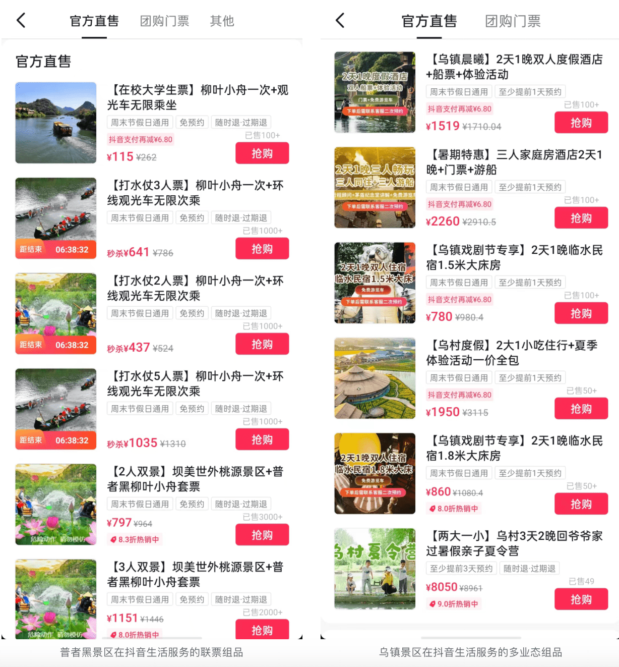 同样是在抖音生活服务开启多类型组品的乌镇景区,在暑期推出“乌镇纳凉季”景区特色活动套票,依托景区本身的多业态经营及服务能力,将景区内门票、船票、住宿、餐饮、景区演出等多产品进行组合售卖,同时还推出了适用多人、多日的票型,为游客提供“吃、住、游、玩”等一站式的夏游乌镇体验。