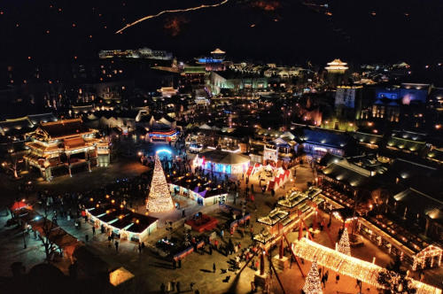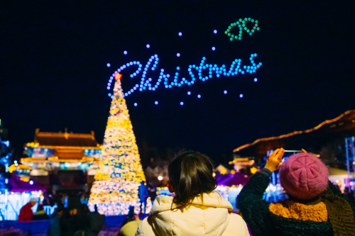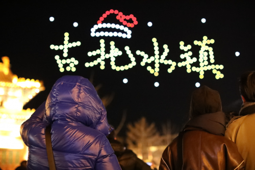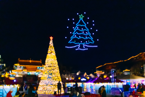 当热闹与欢乐席卷日月岛广场,圣诞树、圣诞礼物盒、圣诞老人、带有圣诞帽的“古北水镇”字样...限定版无人机交织出绚烂的画面,勾勒出一幅幅璀璨的光影场景,在冬日的“北国风光”中,照亮了整个古北水镇。