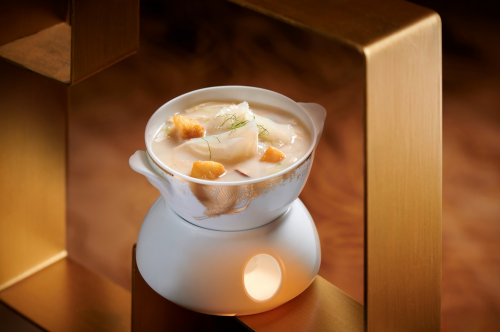 此非凡的九道菜盛宴将带来两家餐厅的其中一些招牌菜式,包括帝影楼的卡露伽鲟鱼子贵妃蚌冻、帝影拆鲟鱼羹、南乳肉汁文火煨澳洲青边鲍鱼,以及海味观的陈皮酥牛肉、黑松露脆皮烤鸡、花胶上海酱肉配菜饭。胡师傅及黄师傅更特别共同创作了以石斑及带子入馔的前菜如花似玉配凉果梅子汁,定能刺激宾客的味蕾,为接着下来的多道美馔揭开序幕。