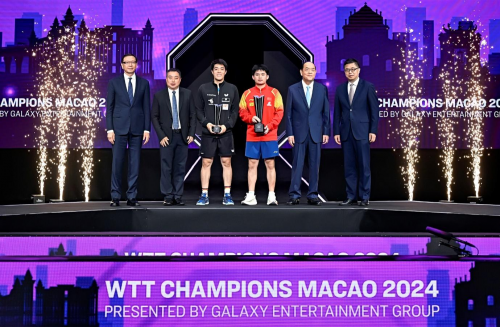 作为巴黎奥运会后首个高级别国际乒乓球赛事,「WTT 澳门冠军赛」一连7日于澳门东亚运动会体育馆举行,经过共计62场的精彩对决,最终男子及女子单打赛事分别由中国乒乓球队员林诗栋先生及孙颖莎女士勇夺桂冠。赛后,一众嘉宾为男子及女子单打冠、亚军得主颁发奖项。出席颁奖礼的嘉宾有澳门特别行政区行政长官贺一诚伉俪;WTT世界乒联董事会主席、国际乒联第一副主席、中国乒协主席刘国梁先生;特区政府社会文化司司长欧阳瑜女士;社会文化司司长办公室主任何钰珊女士;中央人民政府驻澳门特别行政区联络办公室宣传文化部部长万速成先生;中华人民共和国外交部驻澳门特别行政区特派员公署新闻和公共外交部主任高原参赞先生;WTT世界乒联首席执行官、国际乒联首席执行官史蒂夫.丹顿先生;银娱副主席吕耀东先生及董事程裕昇先生。