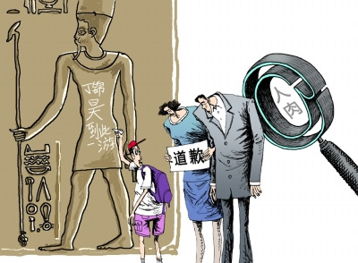新闻背景:网友“空游无依”发微博称,他在埃及卢克索神庙旅游时,在浮雕上看到中文“丁锦昊到此一游”,他对此十分羞愧,并向导游道歉。此微博引发网友声讨,人肉“题名者”众多。 5月25日,这名孩子及其父母主动给媒体打电话,向埃及、向全国的人们道歉。
