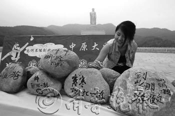 5月28日,在河南平顶山尧山中原大佛景区,很多游客在参观完大佛后,都到景区专设的刻字留念处,把附带自己姓名的“到此一游”刻在石头上或写在签名板中。中新社发