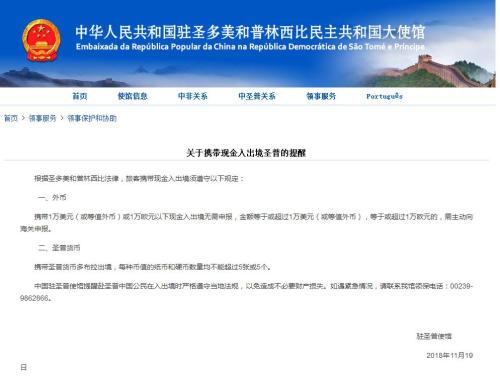 据中国驻圣多美和普林西比大使馆网站消息,根据圣多美和普林西比法律,旅客携带现金入出境须遵守以下规定: