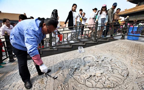 工作人员在北京故宫阶陛之间的云龙石雕上,清理不听劝阻的游客扔在上面的硬币。 视觉中国 资料图