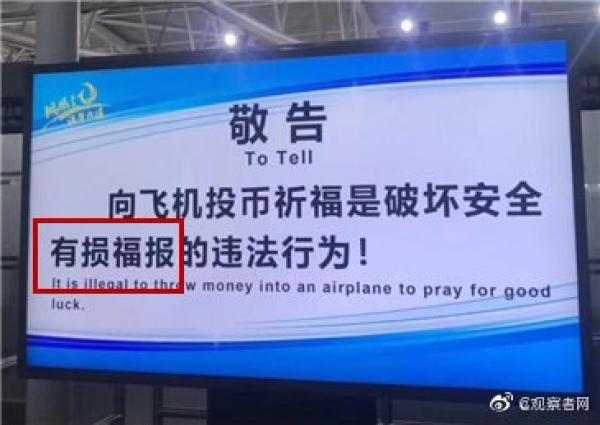 最近,有微博网友发了一张机场安检口宣传标语的照片,上了热搜。标语内容是:“向飞机投币祈福是破坏安全有损福报的违法行为!”,标语被证实来自三亚凤凰国际机场。