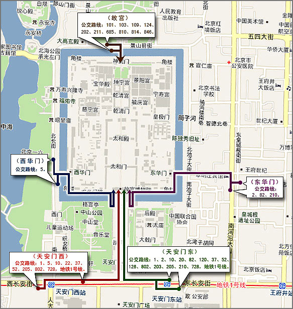 从天安门经端门即可到达,或从东华门或西华门沿东、西筒子河路前行均可到达。