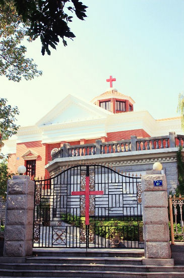 1934年由中国人设计、建造的西式基督教堂。三一堂的建筑独具一格,呈十字立体式的罕见造型,四方八面排水的黄瓦屋顶上,居中矗立着八角钟楼,顶尖的十字架高耸云天。红墙装饰着流畅的三角形线条,四面敞开十二道大门、十六扇窗户极为宽大,具有通风、采光、疏散的实用特点。