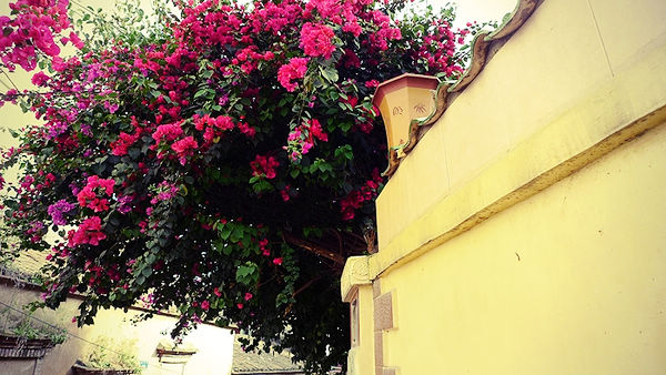至于鼓浪屿家常的植物,那是根本数不过来:三角梅、樱桃、扶桑花、枙子花、黄草蒲、马兰、蝴蝶花、茑萝等在门廊、石缝、墙根和路旁爬高跃低,古榕树、凤凰树、木棉树树影婆娑,任游人在树下歇把脚;开花时,娇艳了半边天;龙眼、木瓜、香蕉树在秋天争相以硕果压枝。