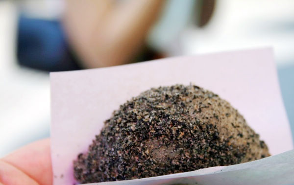 售卖时,摊主拉出摊车下面的抽屉,取出非常Q的糯米糍粑团,用钝刀将小糍团割一个口子,填入花生碎、黑白芝麻碎和糖粉混合成的馅料,再滚满炒香的黑芝麻碎 末,一份“麻糍”就做好了。光是欣赏摊主熟练的动作经值一半的价钱了。