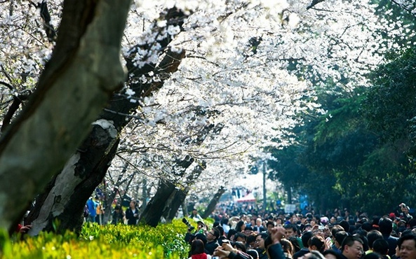 武大樱花开于三月中旬,至下旬最为鼎盛,花期较短,仅13-20天左右。每年樱花盛开之时,来自全国各地的游人旅客如织如潮,有百万以上的游客慕名而来。樱花大道旁摩肩擦踵,樱花纷飞,好不美丽!武大校园内的樱花最早由侵华战争时期占领武汉大学的日本军人所种植,武汉三镇光复后,武大的师生们又引进了更多的樱花品种,经过多年来的培育已经形成很大的规模。每当三月,校园就成为了樱花的海洋,各地的游人们纷纷前来观看,而学校领导和学生均表示从未组织樱花节,游客都是慕名而来自发入校,但学校对组织学生们为游客服务,樱花盛开时节,樱园酷似花的海洋,成千上万游客慕名而至,留连观赏,如醉如痴,大有“三月赏樱唯有武大”的意趣。