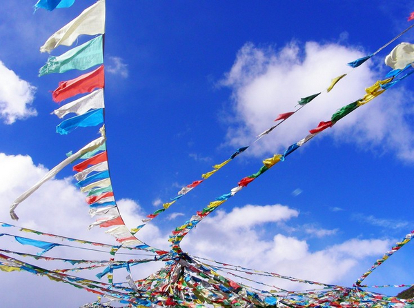 九寨沟藏民称为“葛达”,意为插在门口的旌旗,实是密宗文化与中原文化相结合的产物。经幡根据其用途和不同的内容长短不一,短的几米,长的树十米,分蓝、白、红、绿、黄五种颜色,在长经幡的边上还有各种颜色的小装饰片,上面印有“龙达”。九寨沟的经幡多用木条做成旗杆,且高大,多为竖插,横挂的较少,这是九寨沟经幡的特点。