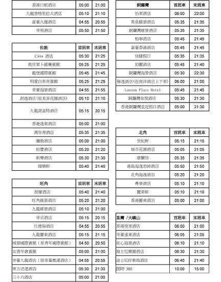 (2)、机场穿梭巴士:搭乘机场快线到了市区的香港站以及九龙站之后,旅客还可利用免费的机场快线机场巴士前往部分酒店(30余家)。乘客只需在上车前出示机场快线车票、机票、登记证、机场员工八达通卡或亚洲国际博览馆入场证、节目门票等有效证明,即可搭乘。