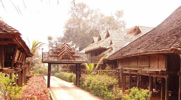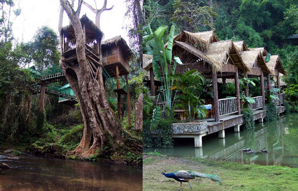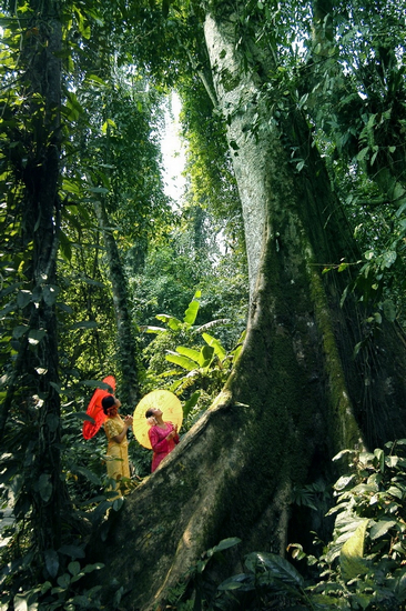 来到版纳,最令人心动的就是那成片的竹林以及掩影在竹林中的一座座美丽别致的竹楼。从外形上看,它像开屏的金孔雀,又似鹤然起舞的美丽少女,美丽的景致让人恍然如在梦中。一棵一棵高耸入天的大树,巨大的树冠,浓荫四佈、遮天蔽日,像一把一把的大伞,树屋就盖在这些粗大的树干上“树上旅馆”里,入夜,随着最后一屡阳光消失,林中渐渐暗下来,萤火虫带着微弱的亮光飞来飞去,好像是森林的卫士,与你做伴;聆听哗哗溪流进入梦乡……