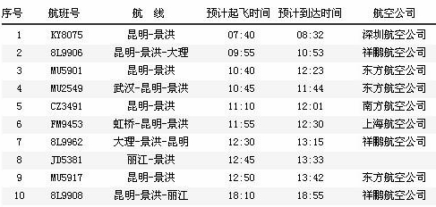 西双版纳景洪机场位于景洪市南部嘎酒乡是云南省内仅次于昆明的第二大航空口岸,距景洪市区5公里。自1990年通航以来,先后开辟了至昆明、大理、丽江、上海。郑州、天津、成都、重庆等主要城市的国内航线。还开通了至泰国曼谷、清迈。老挝琅勃拉邦的国际航线。昆明至西双版纳的直达航班空中飞行时间约50分钟,全票750元/位。除泼水节外一般均有打折票。