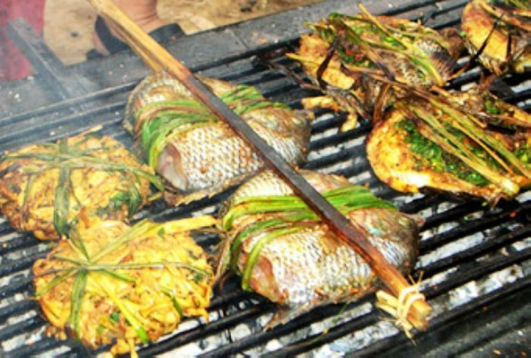 布朗族的传统名菜,鲜香俱全,味美可口。其制作方法:把鱼剖开洗净,将辣椒、盐等各种佐料切细拌匀后填入鱼腹内,再用芭蕉叶包好,捂在火塘的炭火下面,烧熟即可食用。